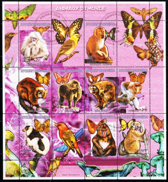• FOLHA DE SELOS – MADAGASCAR – 1999 (TEMÁTICA: PRIMATAS/BORBOLETAS). USADO.