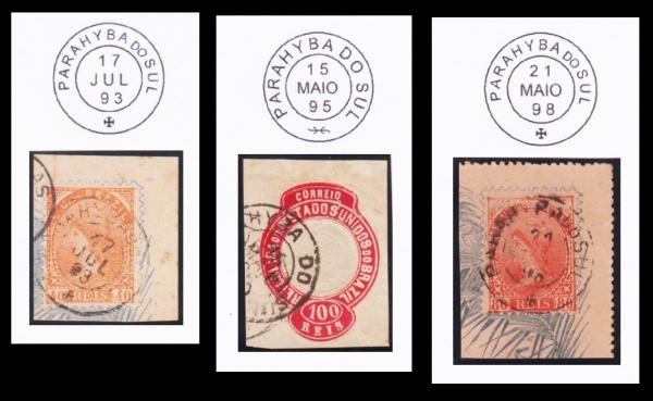 • INTEIRO POSTAL – BRASIL – FRAGMENTO COM CARIMBO: PARAHYBA DO SUL. DATADO DE: 17.07.1893 / 15.05.1895 E 21.05.1898. USADOS. NA COR PRETA.
