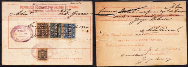 • VALE POSTAL: BRASIL  1915. VALE POSTAL NO VALOR DE 21$200. DE MATO GROSSO/MT  DATADO DE 03.06.1915. COM SELOS RHM: D-03 + D-04 + D-08 + RHM: 141.
