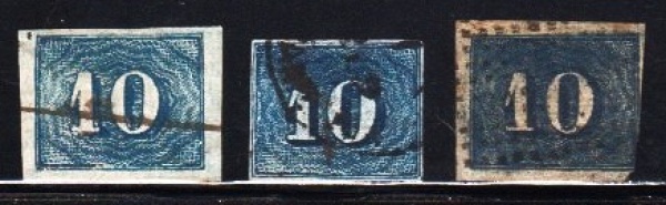 • SELO: BRASIL (IMPÉRIO)  1854/1861 (NUMERAIS  COLORIDOS). RHM: 19 (AZUL CLARO), 19-A1 (AZUL ESCURO) E 19-A2 (AZUL AÇO). 10 RÉIS. USADO. VL. CAT. 220 U.F.