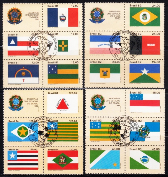 • SELO: BRASIL 1981/1984 (COMEMORATIVO) BANDEIRA DOS ESTADOS. RHM: C-1231/C-1235  C-1294/C-1298  C-1363/C-1367 E C-1425/C-1429. QUADRA USADA COM CARIMBO COMEMOTARIVOS: 1981 (BRASILIA), 1982 (NATAL), 1983 (FLORIANÓPOLIS) E 1984 (CAMPO GRANDE). VL. CAT. 42 UF.
