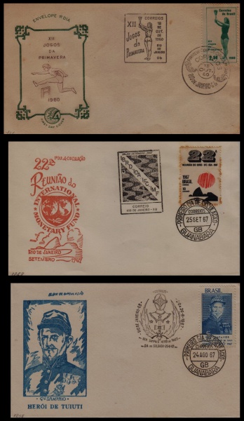 • FDC: BRASIL – 1960/1967 (TEMÁTICA: ESPORTE/ECONOMIA/HEROI MILITAR). 3 FDC PARTICULAR COM CARIMBO COMEMORATIVO E OU DE PRIMEIRO DIA DE CIRCULAÇÃO.