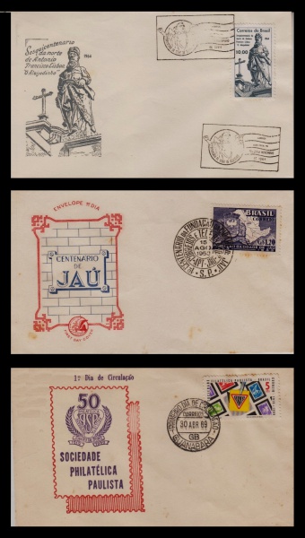 • FDC: BRASIL – 1953/1964/1969 (TEMÁTICA: ESCULTOR/FUNDAÇÃO DE CIDADE/SELO SOBRE SELO). 3 FDC PARTICULAR COM CARIMBO COMEMORATIVO E OU DE PRIMEIRO DIA DE CIRCULAÇÃO.
