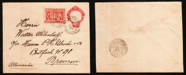 • ENVELOPE: BRASIL – 1923/1929 COM SELOS RHM: EM-73 – USADO – VARADOURO – PARAIBA DO NORTE (DATADO DE 18.1.1923) PARA BREMEN – ALEMANHA (SEM INDICAÇÃO DE CHEGADA). COM PORTE ADICIONAL DE 200 RÉIS RHM: C-15.