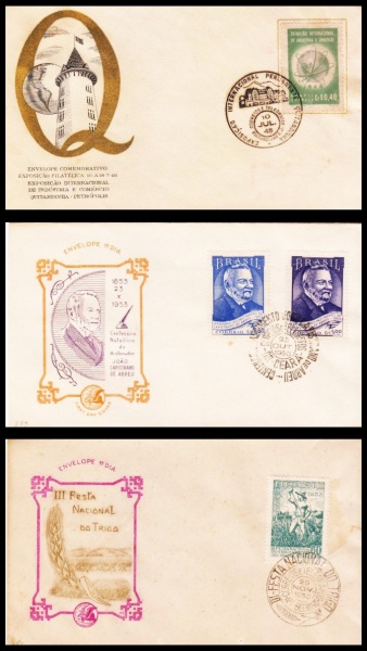 • FDC AUTORIZADO: BRASIL  1948. RHM: 237 (EXPOSIÇÃO INTGERNACIONAL DE INDUSTRIA E COMERCIO).  1953. RHM: 318/319 (CENTENÁRIO NATALICIO DE CAPISTRANO DE ABREU).  1953: RHM: 322 (III FESTA NACIONAL DO TRIGO). COM CARIMBOS COMEMORATIVOS.