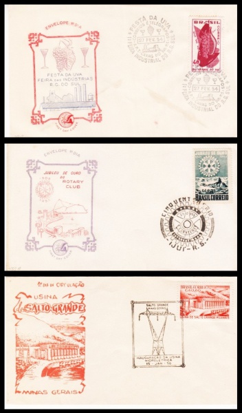 • FDC AUTORIZADO: BRASIL – 1954. RHM: 335 (FESTA DA UVA DE CAXIAS DO SUL). – 1955. RHM: 358 (SESQUICENTENÁRIO DO ROTARY CLUB INTERNACIONAL). – 1956: RHM: 373 (INAUGURAÇÃO DA USINA HIDRELETRICA DE SALTO GRANDE). COM CARIMBOS COMEMORATIVOS.
